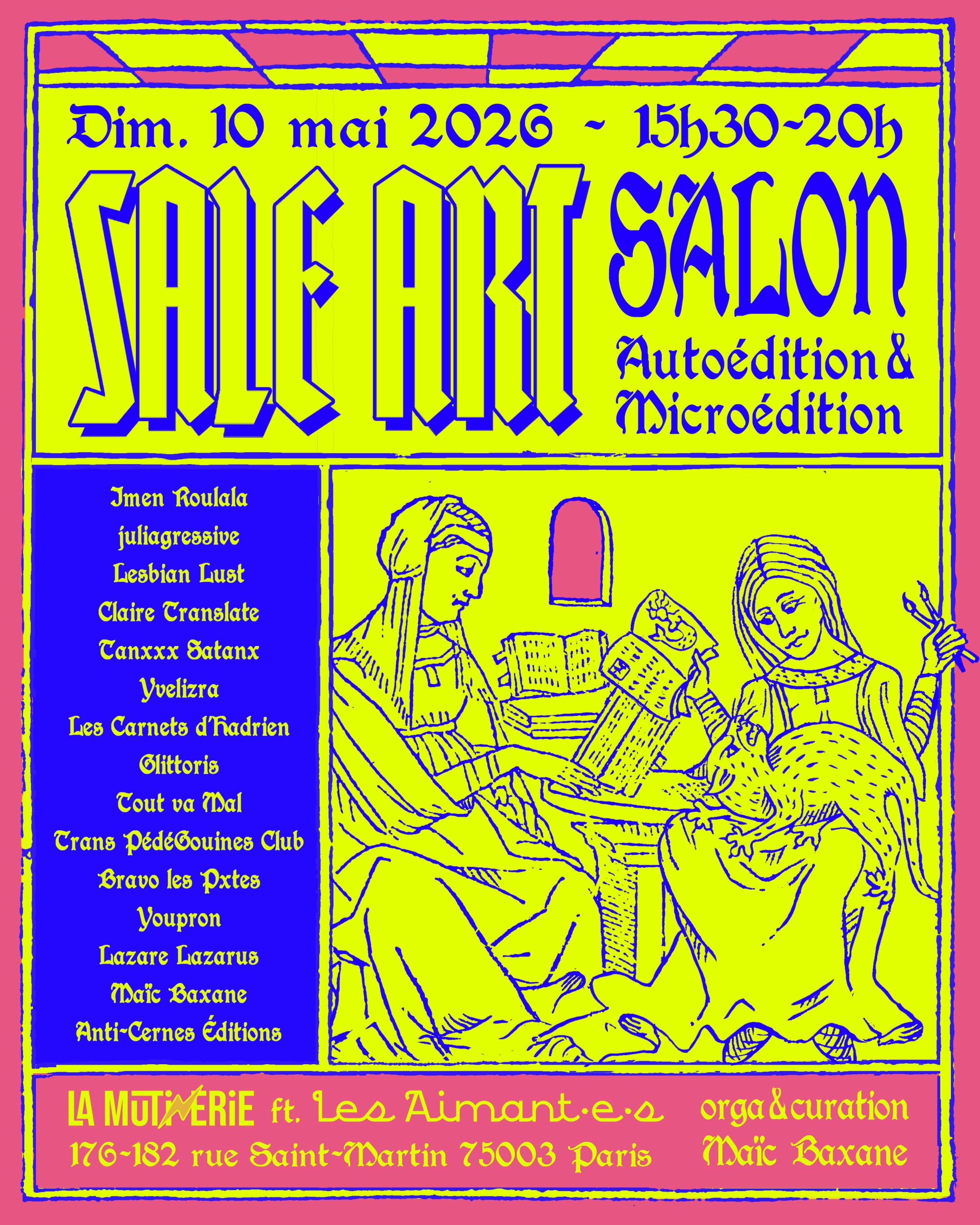 Depuis septembre 2021, j’organise et curate les Sale Art Salons à la Mutinerie, Paris. Ce salon des auto- & micro-éditions rassemble des univers politiques, poétiques, punk, explicites, souvent minoritaires.